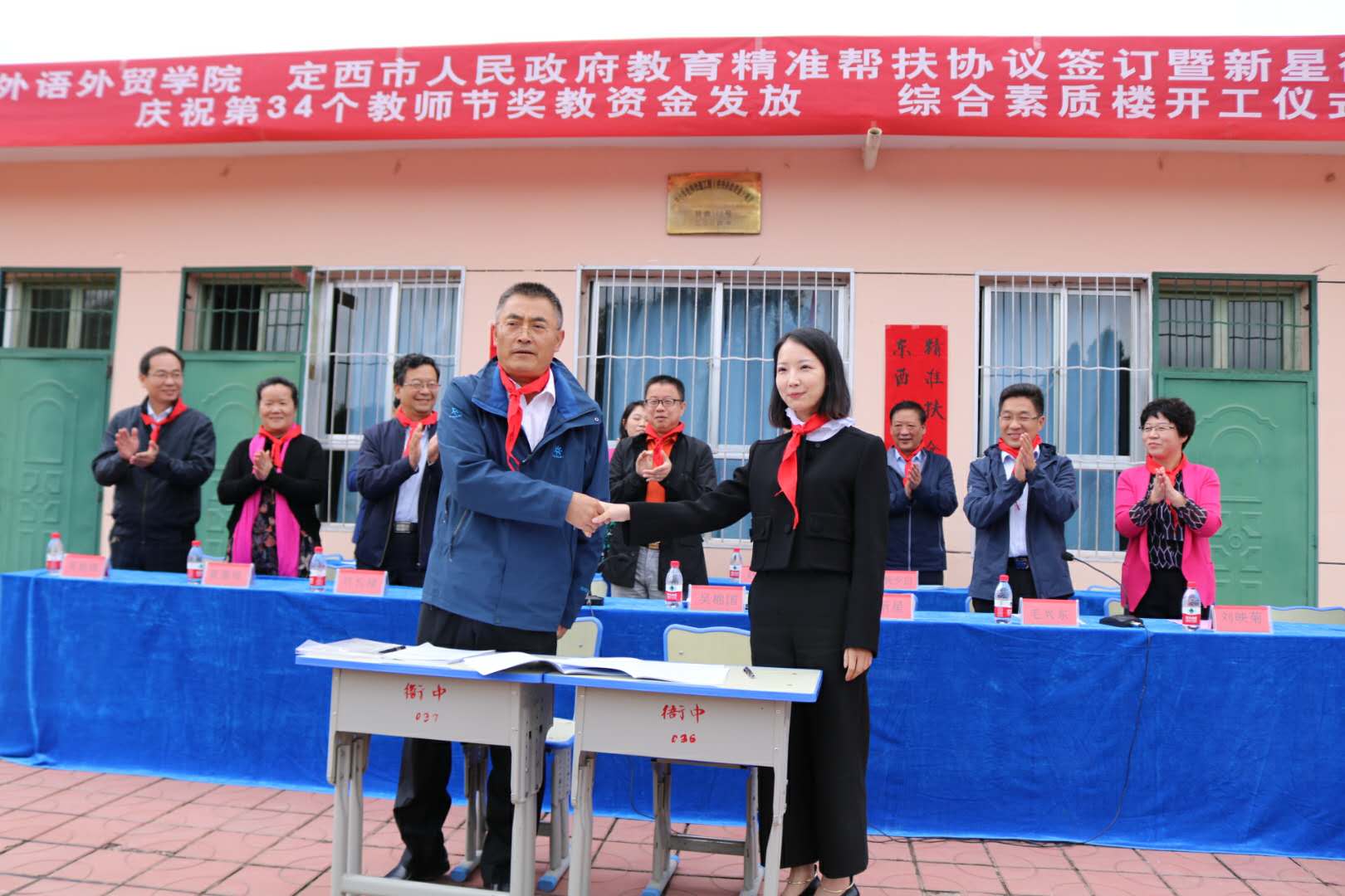 10日上午,定西市临洮县衙下新星致公学校红旗招展,吴棉国、吴新星一行与全校300多名师生在校操场共同庆祝第34个教师节。庆祝大会上,吴新星代表我校与定西市政府签署了为期十年的帮教助学协议,设立“新星教育专项资金”4500万元。在帮扶期,计划面向定西定向招收优秀贫困学生240名,资助四年的学费、书本费和住宿费,资助金额约2500万元;向衙下新星致公学校捐赠2000万元支持学校基础设施改造和教学质量提升。此次,我校带来了总出资520万元的校综合素质楼第一批156万元建设资金,向学校优秀教师发放了15万元奖教金。