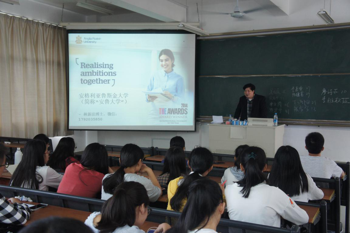 随后,林新法向我校各专业近400名学生介绍了剑桥地区大学的概况。林新法与同学们一同吟诵了徐志摩先生的《再别康桥》,引出安格利亚鲁斯金大学主校区的地理位置,继而介绍英国的地理概况。林新法以自身学习经验出发,讲授英文学习的要点,鼓励同学们不断提升英文水平。活动最后,林新法与同学们热烈互动,问答十分精彩。