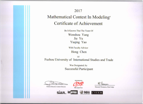 近日,2017年美国大学生数学建模和交叉学科竞赛(MCM/ICM)成绩揭晓。我校蔡兴、邹凤和陈晓娴三位同学组成的团队荣获数学建模竞赛三等奖,杨文寿、俞捷和姚雨晴三位同学的团队荣获交叉学科建模竞赛三等奖。