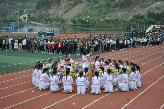花束队的姑娘们捧着五彩缤纷的花束向运动会献礼