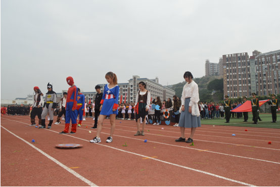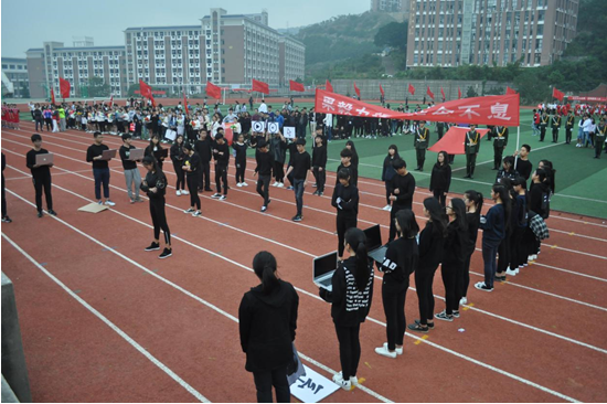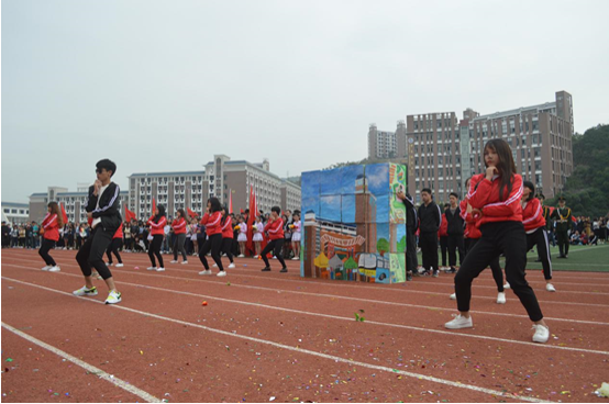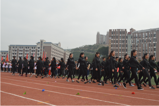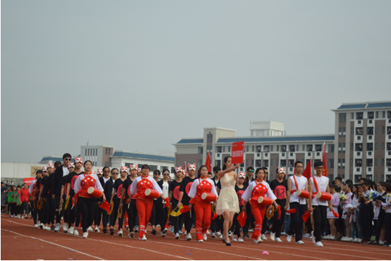 伴随着《运动员进行曲》激昂奋进的节奏,国旗队、校旗队和花束队、各中心、系(部)组成的方阵队喊着嘹亮的口号,迈着铿锵有力的步伐,以饱满的姿态依次列队进场。由各系学生组成的表演方阵创意频出、高潮迭起、尽显风采,引得掌声、喝彩声不断。