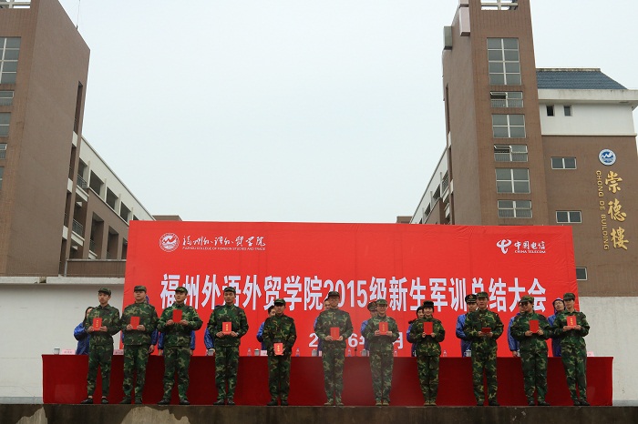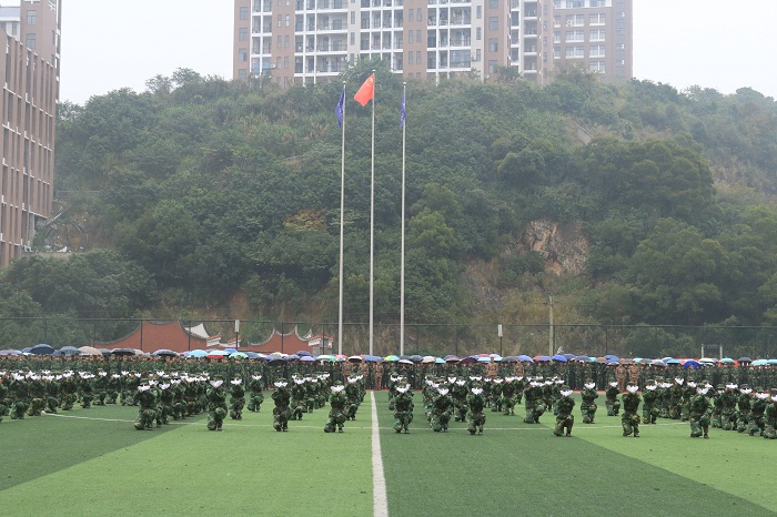 1月15日下午的军训总结大会在雨中进行。风雨中,3800多名2015级新生上演声势浩大的方阵表演、军体拳等精彩的军训科目表演。校党委书记陈炳钦为同学们的昂扬精神、顽强毅力和精彩表演点赞。他指出,此次军训获得了丰硕的成果。通过军训,同学们感受了当代军人的英勇风范,见证了人民军队的英雄本色,掌握了国防知识与技能,增强了国防观念,磨练了意志,提高了自我约束力和思想境界,培养了团队精神、提升了集体荣誉感,更提高了对我校的归属感、凝聚力和向心力。希望同学们以军训为新起点,把解放军的优良作风真正贯穿到工作、学习中去,进一步发扬我校“融会中外、经世致用”的校训精神和“崇德、勤学、求实、创新”的校风精神。承训部队副参谋长袁云福上校高度评价了我校受训同学的不俗表现,及不畏艰辛、不惧风雨的顽强精神,希望同学们发扬军队优良传统和作风,努力把自己培养成全面发展的社会主义事业建设者和接班人。