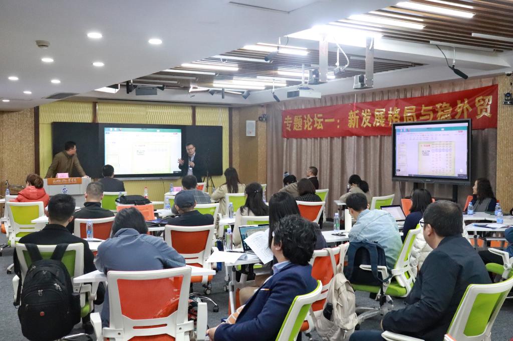 当日下午,四场专题论坛同时举行,嘉宾们围绕新发展格局与稳外贸、疫情与国际经济进一步对外开放、创新与高质量发展、全球价值链与国际贸易等议题展开研讨。在一流本科专业建设圆桌论坛中,来自省内各高校的国际经济与贸易学科的主要学科带头人或专业负责人围绕一流本科专业建设议题建言献策。在优秀硕博士论坛中,省内高校的国际经济与贸易专业相关的6名博士、硕士研究生依次进行了论文报告,参会专家对论文进行精彩点评。