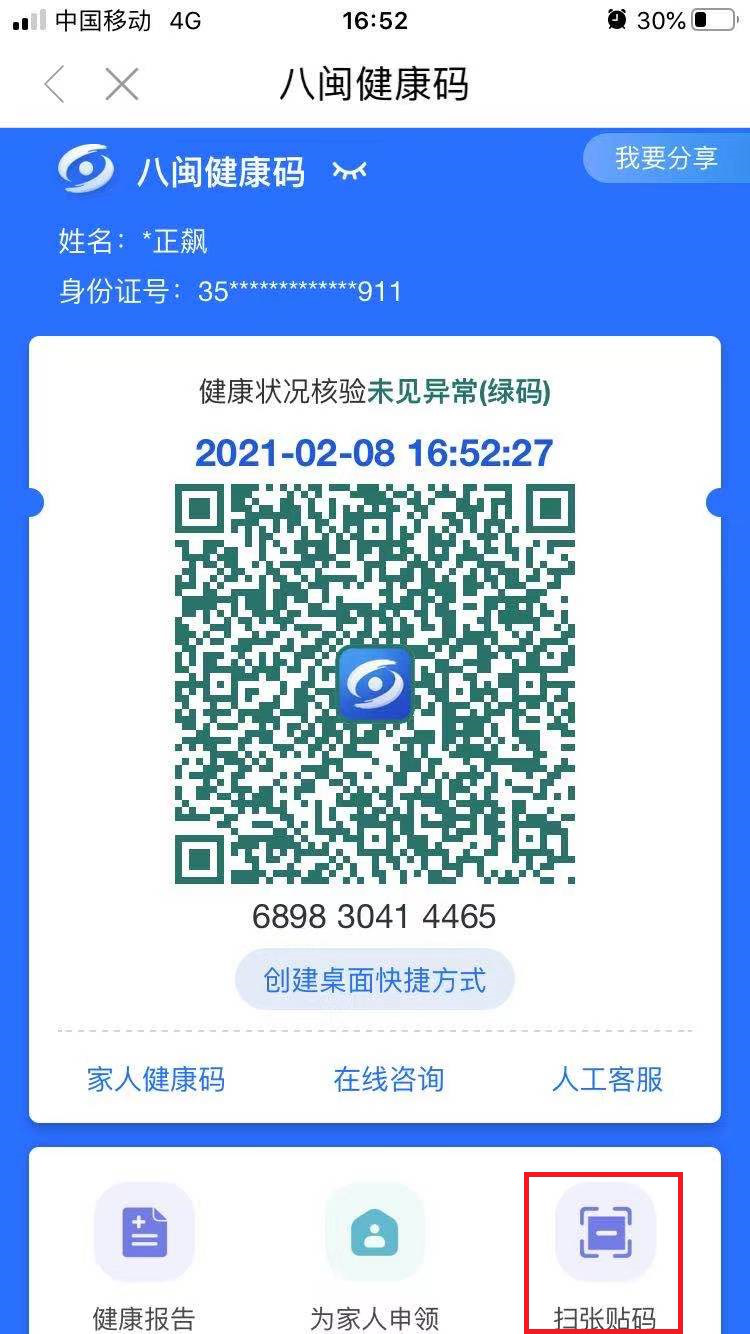 打开个人闽政通APP、支付宝或微信上的八闽健康码,点击“扫张贴码”。