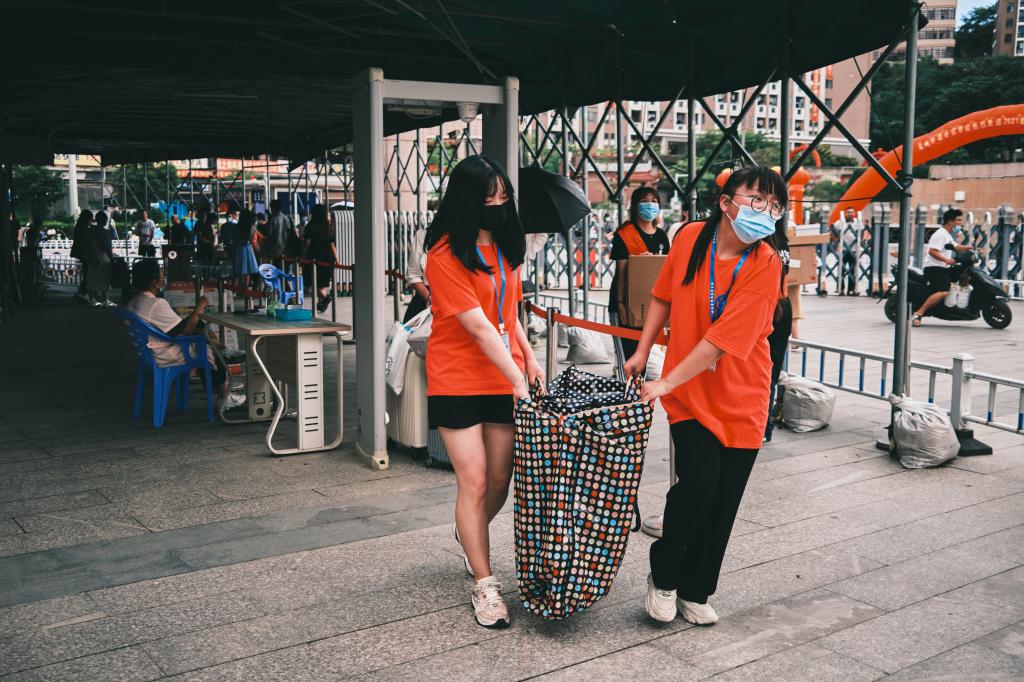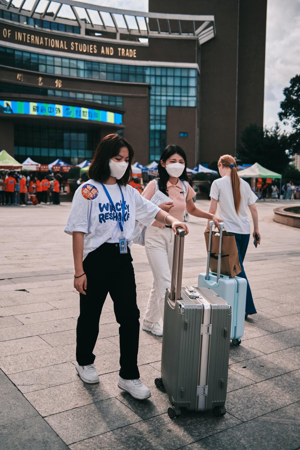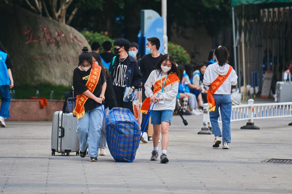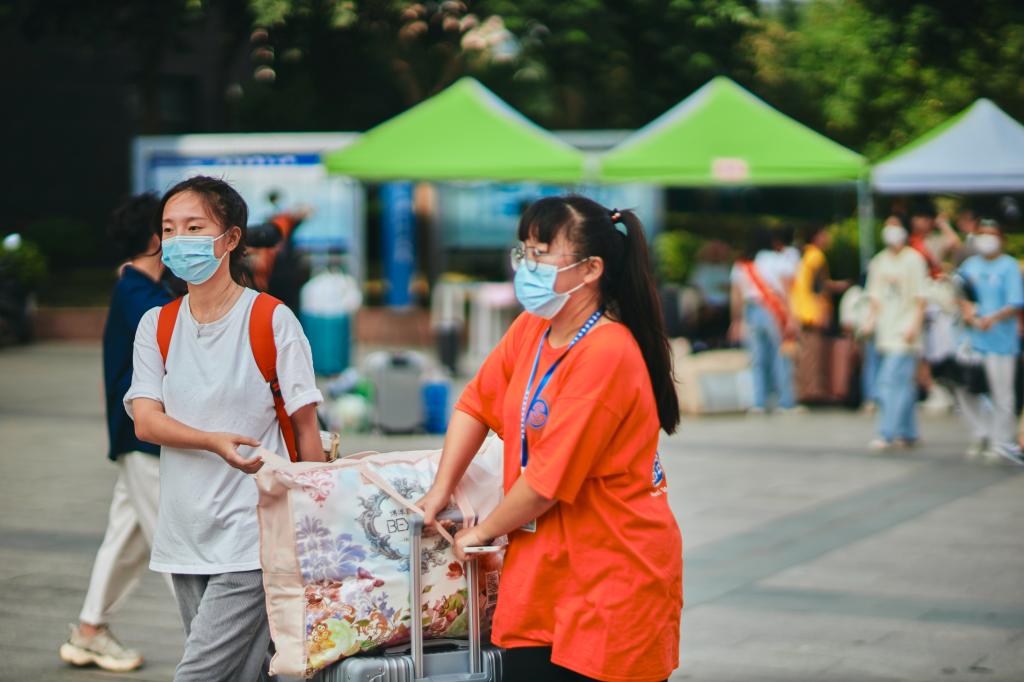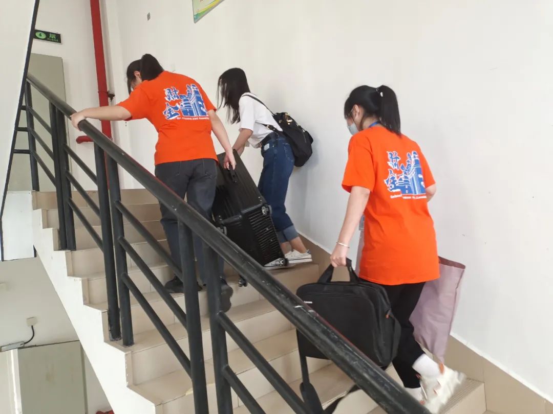 到校的新生陆续搭乘摆渡车前往宿舍区域,此时志愿者们早已等候在宿舍楼下,学长甚至学姐都化身成“大力士”,扛起新生们的行李就上楼。学生党员也活跃在迎新现场,以实际行动践行承诺。