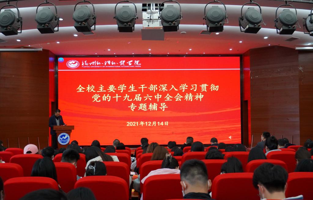 12月14日,我校组织开展全校主要学生干部深入学习贯彻党的十九届六中全会精神专题辅导,校领导陈炳钦、徐国立、黄跃舟,党委学生工作部负责同志,校团委负责同志,各学院分党委书记、分团委书记和主要学生干部300余人参加会议。