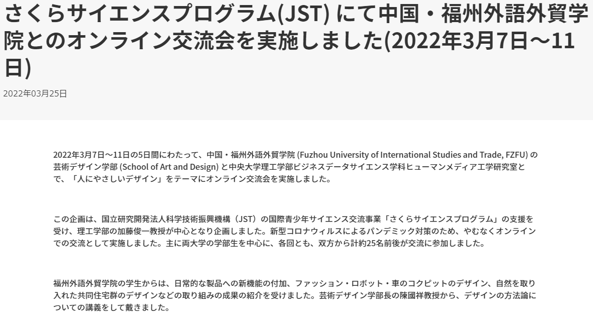 在该学术交流会上,我校产品设计、环境设计、动画、服装与服饰设计、数字媒体艺术、视觉传达等专业的同学对相关专业新文科建设阶段性成果——“人性化设计”创意与日本高校的师生们进行交流。日本中央大学理工学院同学就基于人类友好环境理念的人机交互设计项目相关实验研究情况进行了介绍。