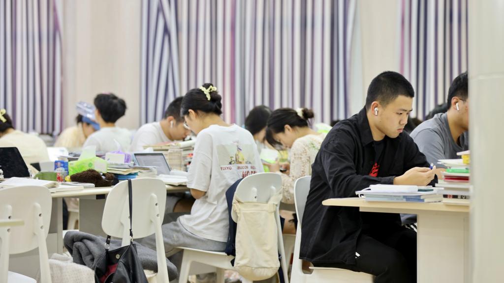 图书馆里、自习室内福外考研学子每天与题海相伴低头是密密麻麻的复习资料