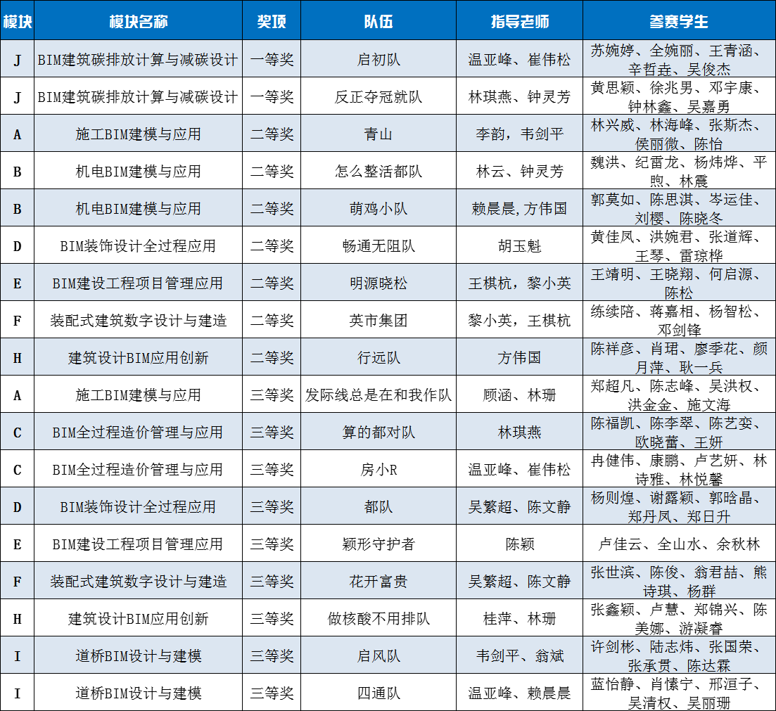 日前,“第九届全国高校BIM毕业设计创新大赛”全国网络竞赛顺利举办。我校智能建造学院18支参赛队伍经过赛前精心准备和赛场上的激烈角逐,荣获全国一等奖2项,二等奖7项,三等奖9项。获得全国一等奖的团队将入围全国总决赛,角逐全国特等奖奖项。