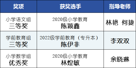 11月25日,第十届福建省高校师范生教学技能大赛在宁德师范学院圆满落幕。凭借扎实的专业素质、稳定的现场发挥,我校学子荣获大赛三等奖2项,优秀奖1项。