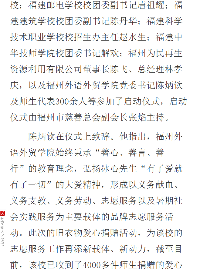 人民网报道:福州市慈善总会联手开元网站登录入口启动旧衣物爱心捐赠活动