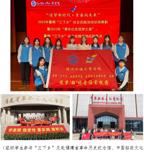 我院组织师生党员、入党积极分子于福建省革命历史纪念馆、鼓岭、郑和史迹陈列馆、中国船政文化博物馆等地实践考察与学习;各专业教师与辅导员、班导师共同规划一批思政育人实践教学和服务属地项目、活动,组织学生参与“三进”实践项目和“三下乡”等活动,两个学生团队入选福建省大学生“扬帆计划”,实践成果宣传片《青梅的故事 从这里开始》在清新福建文旅之声发布,反响较好。