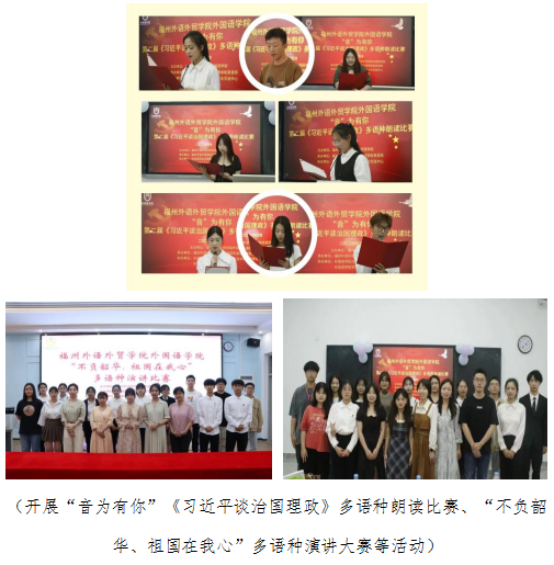 深度结合“三进”工作,成功举办“音为有你”《习近平谈治国理政》多语种朗读比赛、“传承红色经典,书写时代芳华”多语种书法比赛、“奋斗新青年,追梦新时代”多语种主题征文比赛、“用外语讲好中国故事”微电影大赛、“不负韶华、祖国在我心”多语种演讲大赛等活动,用外语传递中国声音、讲好中国故事。