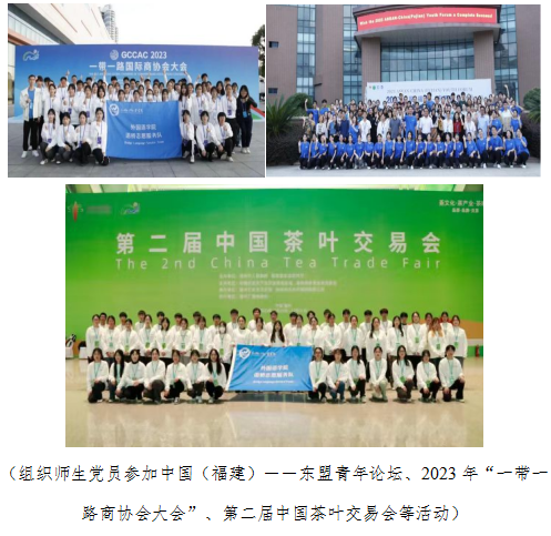 党支部建立每月理论学习及实践教育制度,不断创新学习形式、注重教育作用。积极响应号召,弘扬和践行习近平总书记提出的志愿服务精神,组织师生党员参加中国(福建)--东盟青年论坛、2023年对外文化交流活动周、第八届海上丝绸之路(福州)国际旅游节、2023年“一带一路商协会大会”、第二届中国茶叶交易会等活动,有序流畅完成了论坛发言主持、嘉宾接待、引导解说、会务服务、翻译口译等工作,运用所学的外语专业知识与志愿服务实践相结合,展现福外青年责任担当,发挥党员先锋模范作用。语桥志愿服务事迹被环球网、福建日报、人民网福建频道等主流媒体聚焦报道,并荣获省外事办、市电视台等主办单位多封感谢信。