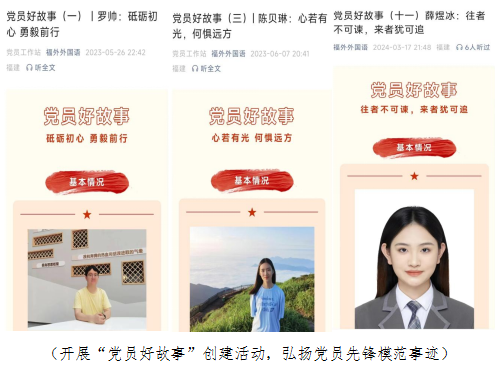 始终坚守育人初心,牢记时代使命,以高质量党建引领高质量发展,持续开展“党员好故事”创建活动,通过弘扬党员先锋模范事迹,发挥高年级优秀学生在思想引领、专业学习、四六级考试、考公考研、创新创业、职业生涯规划、学科竞赛、专业技能证书、文艺体育等方面的朋辈引领示范作用。