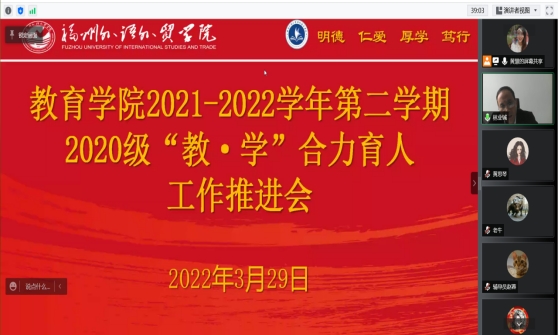 为加强学院的学风建设,发挥班导师、辅导员合力育人,更好地发挥教师在学生成长和成才中的指导作用,实现“全员育人、全方位育人、全过程育人”的目标,教育学院于3月29日下午,召开2021-2022学年第二学期2020级“教·学”合力育人工作推进会。院长林新年,副院长、分党委书记林业铖,系主任、学院办公室,2020级班导师和辅导员参加了会议。