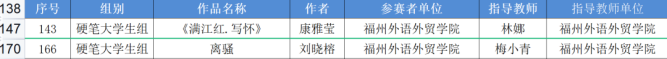 近日,我校三位学子参加了在泉州师范学院举办的福建省第四届中华经典诵写讲大赛“笔墨中国”汉字书写赛,我院康雅莹(指导老师:林娜)、刘晓榕(指导老师:梅小青)入围,获得教育部第四届中华经典诵写讲大赛“笔墨中国”汉字书写大赛参赛资格。