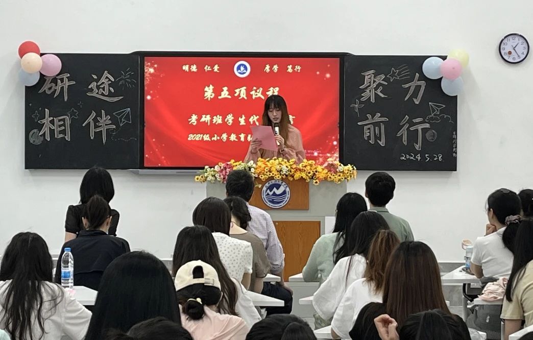2021级小学教育弘毅班张梅作为考研班学生代表发言,她表示考研学习过程中应明确目标、分阶段学习、注重基础知识的学习,提醒同学们要注意身心健康,保持良好的学习状态和心态。考研之路虽难,但只要坚定目标,不忘初心,努力不会辜负每一份梦想的!