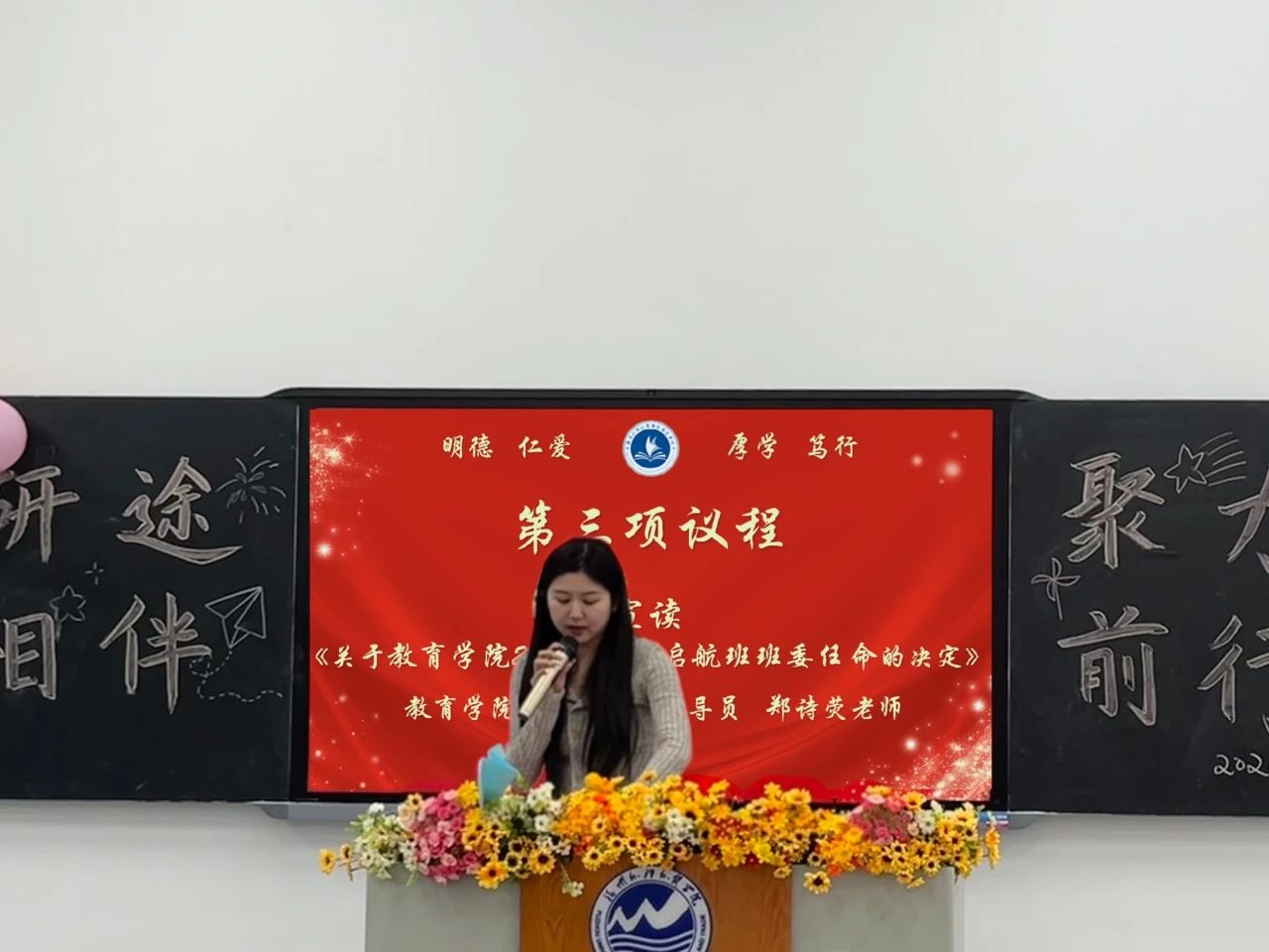 老师们宣读本次教育学院2025届考研启航班成立暨考研寝室授牌仪式相关决定及制度
