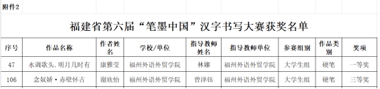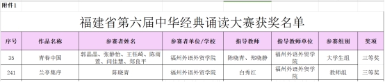 日前,福建省教育厅公布福建省第六届中华经典诵写讲大赛获奖名单,我校外国语学院学生郭晶晶、张静怡、王钰崎、陈雨萱、闫佳慧、郑良平集体诵读的作品《青春中国》(指导老师:陈晓青、郑晓静)喜获经典诵读大赛大学生组三等奖,教育学院陈晓青老师诵读的作品《兰亭集序》(指导老师:白秀红)喜获经典诵读大赛教师组三等奖。教育学院学生康雅莹硬笔作品《水调歌头·明月几时有》(指导老师:林娜)、谢欣怡硬笔作品《念奴娇·赤壁怀古》(指导老师:曾泽钰)分别荣获“笔墨中国”汉字书写大赛硬笔类大学生组一等奖、三等奖。