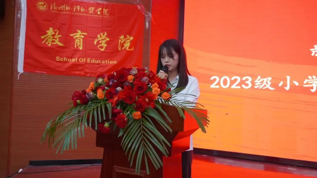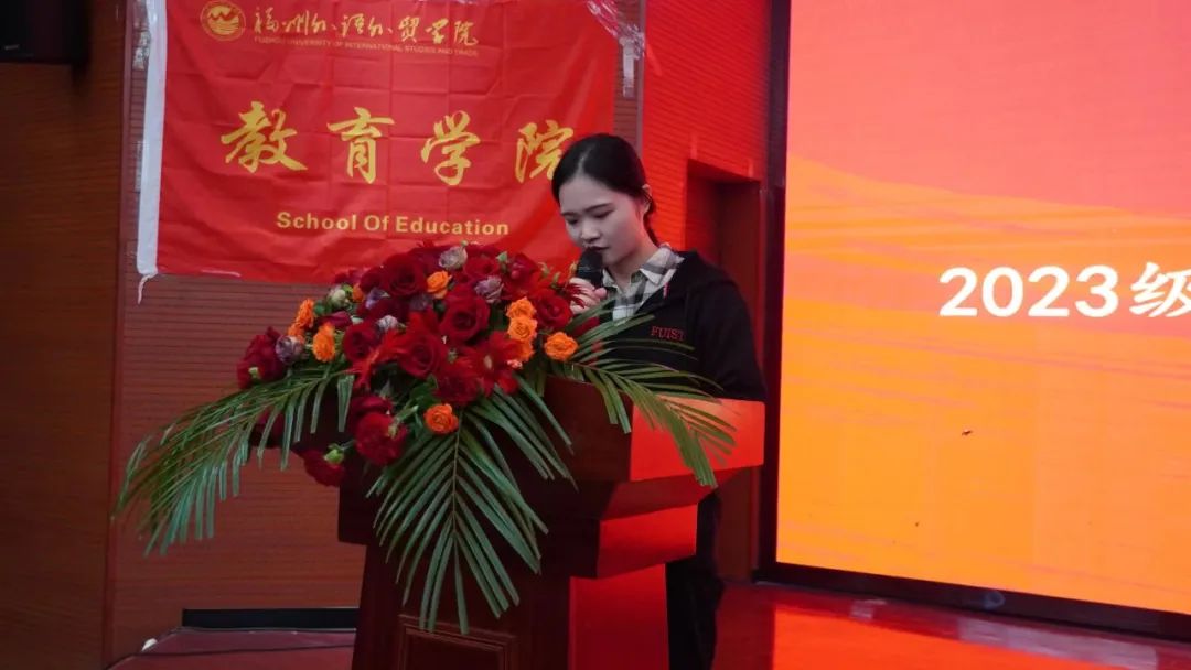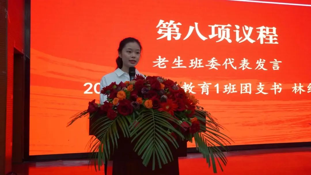 老生班委代表2021级学前教育1班团支书林红婷同学,首先表达了对新生加入教院大家庭的热烈欢迎,同时她也表示希望23级新生班委可以用心做事、以诚待人、不忘初心,面对各种机遇和挑战不退缩,一步步成长为更好的人,无悔自己今天做出的选择,让自己的青春散发出夺目的光彩。