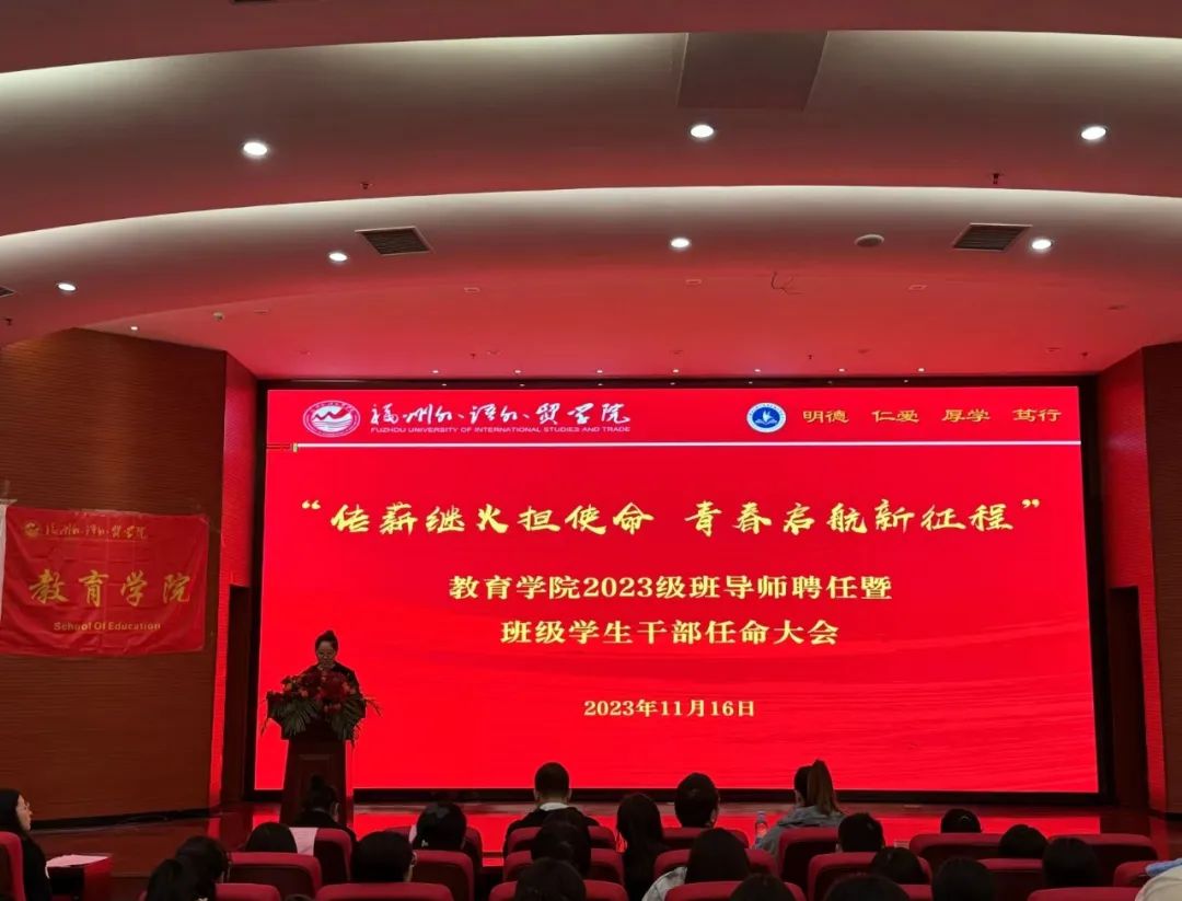 为进一步落实立德树人,构建“教·学”良性互动关系,扎实推进学院班导师工作和班级学生干部队伍建设,营造良好育人氛围,教育学院于11月16日上午11:00时在学术报告厅举行2023级班导师聘任暨班级学生干部任命大会,学院党政领导、各系主任、2023级班导师、辅导员和全体班委参加了会议,院办副主任黄慧主持会议。