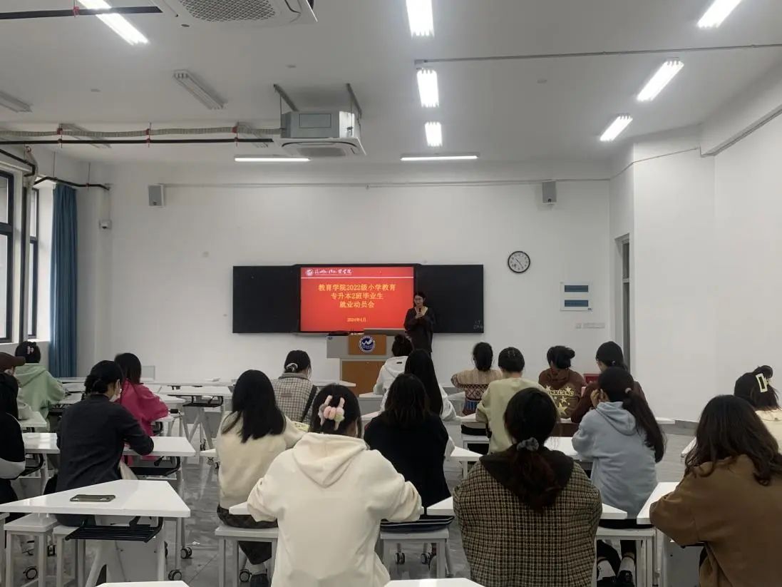 近日,教育学院2022级小学教育(专升本)2班在班导师廖晓榕老师的组织下召开了班会。会上,晓榕老师以“就业引航,青春建功”为主题,为毕业班的同学们介绍了当下的就业形势,降低同学们的就业压力,开导并缓解他们的心理负担。
