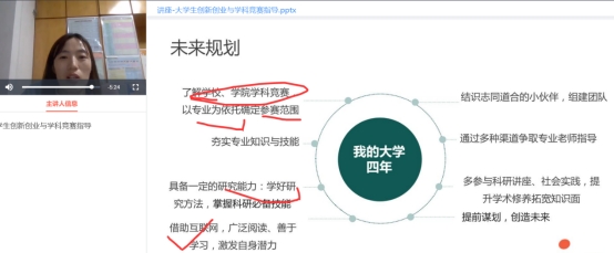 为激发同学们的创新创业意识,调动大家积极参与创业创业和学科竞赛的主动性,2021年12月8日晚上19:30,教育学院马小芳老师通过超星直播平台开展“大学生创新创业与学科竞赛指导”专题讲座,讲座主要面向教育学院2021级全体学生,近百名新生参加了本次讲座。