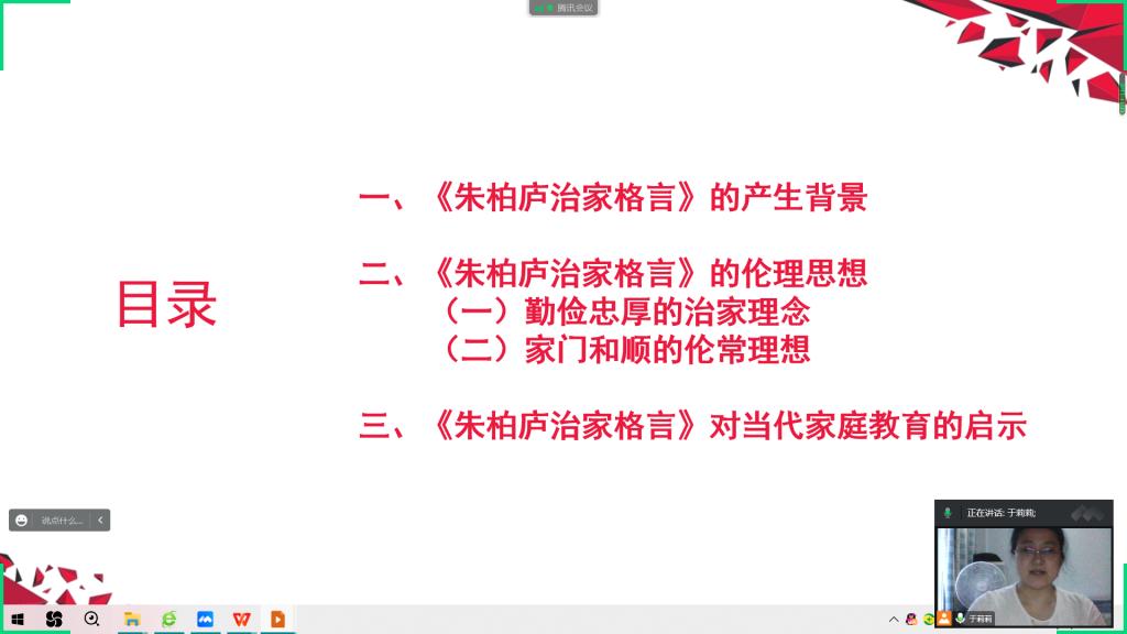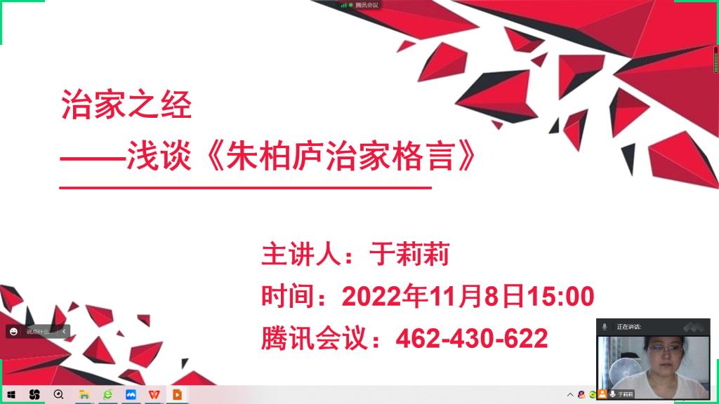 2022年11月8日15时,教育学院汉语言教研室于莉莉老师,通过腾讯会议作题为“治家之经——浅谈《朱柏庐治家格言》”的专题讲座,学校各专业对此感兴趣的学生在线听取了讲座。
