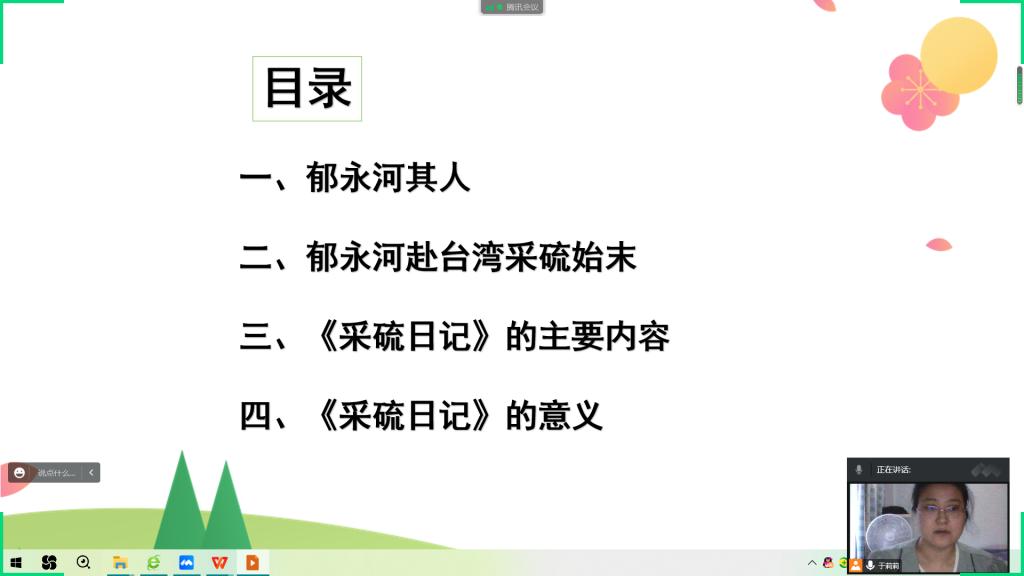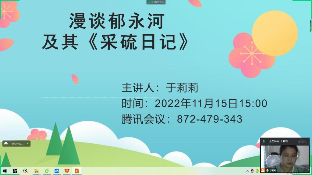 2022年11月15日15时,教育学院汉语言教研室于莉莉老师,通过腾讯会议作题为“漫谈郁永河及其《采硫日记》”的专题讲座,学校各专业对文学和历史感兴趣的学生在线听取了讲座。