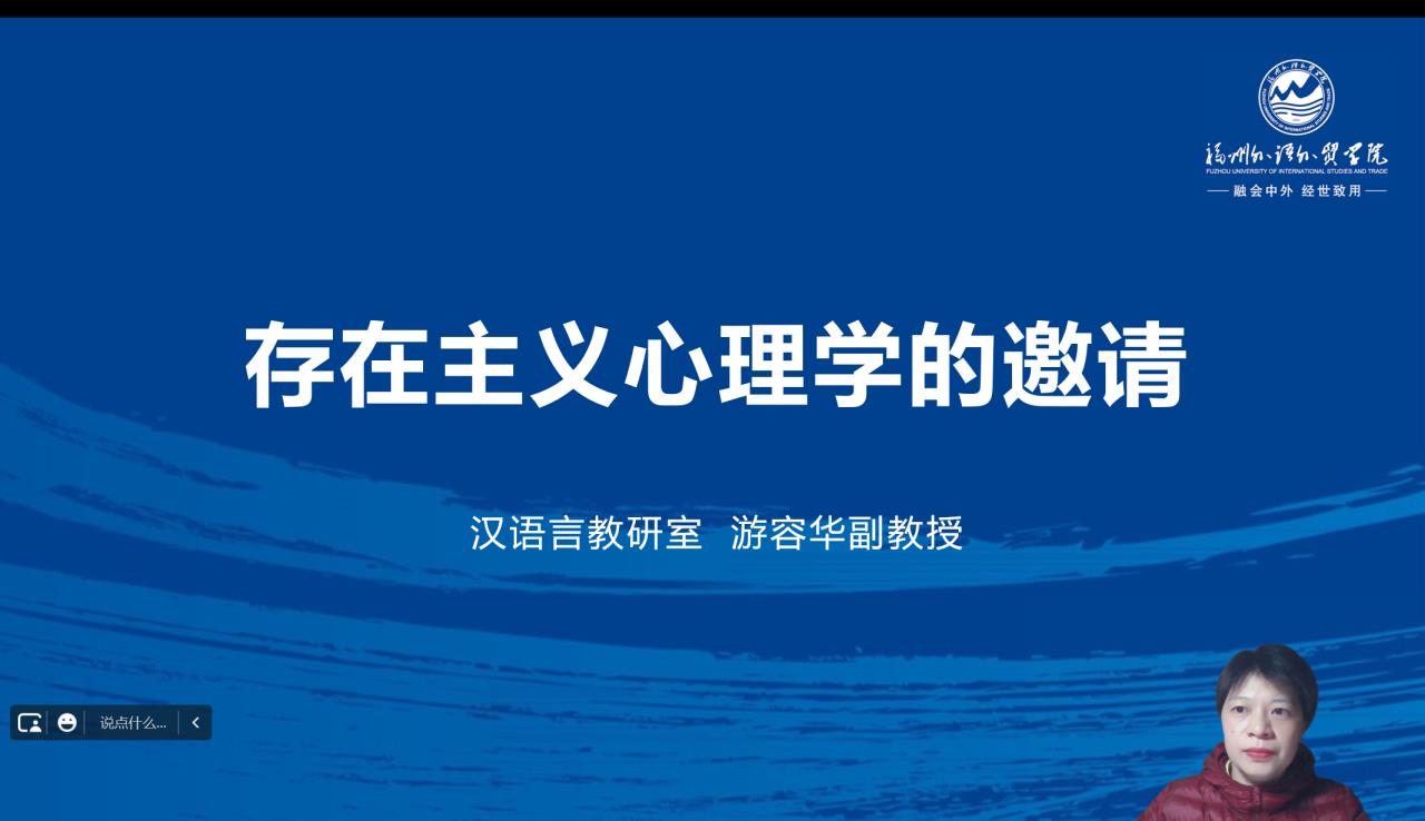 2022年12月7日晚上6点30分,教育学院汉语言教研室游容华副教授在腾讯会议开展了一场主题为“存在主义心理学的邀请”学术讲座,校文学俱乐部部长石秀丽负责统筹线上成员签到,80多位同学在线听取了此次讲座。