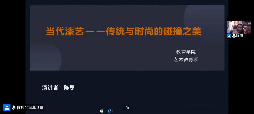 2022年11月29日,教育学院艺术教育系教师陈思于腾讯会议开展“当代漆艺——传统与时尚的碰撞之美” 线上主题讲座,参加讲座的学生有艺术教育系2022级各班学生。