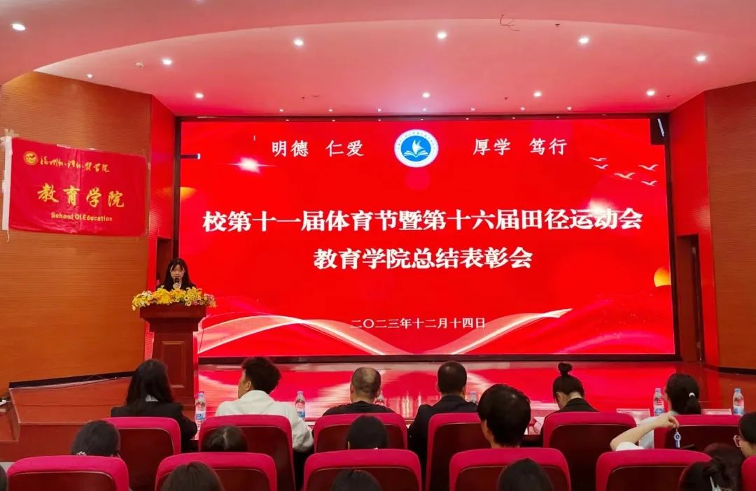 为弘扬敢于拼搏、勇攀高峰的体育精神,表彰在校运动会中表现突出的先进集体和先进个人,更好地搭建我院“运动乐园”平台,12月14日,我院于行政A楼5楼学术报告厅开展校第十一届体育节暨第十六届田径运动会教育学院总结表彰会,学院副院长、分党委书记林业铖副教授,团委负责人、辅导员以及受表彰的学生代表参加了会议。会议由团委田甜老师主持。
