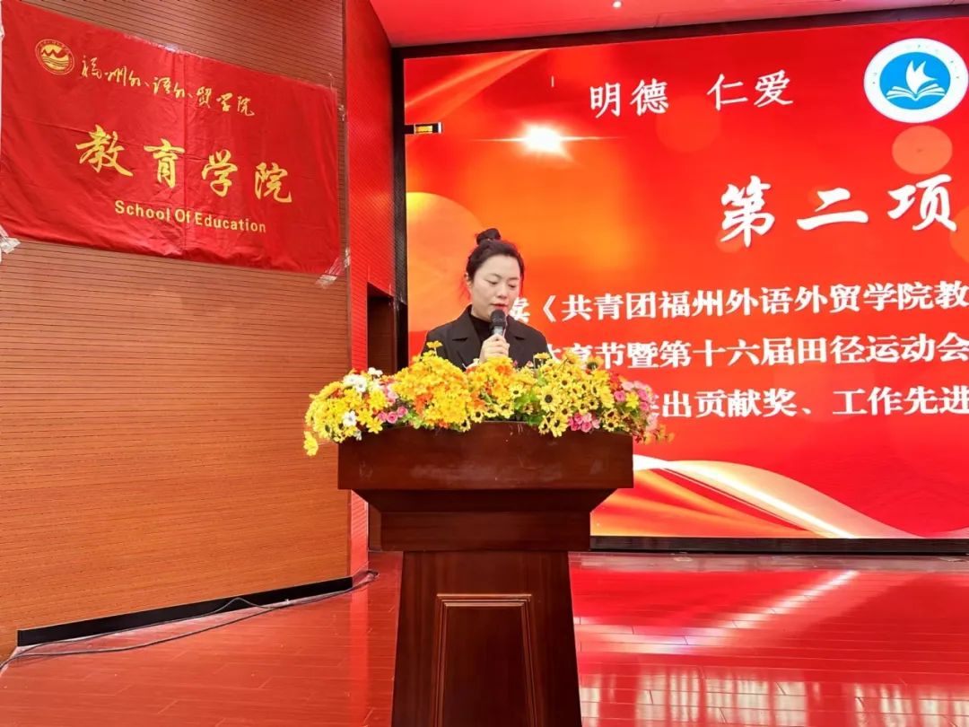 教育学院办公室副主任、团委书记修丽萍老师宣读《共青团开元网站登录入口教育学院委员会关于表彰校第十一届体育节暨第十六届田径运动会优秀志愿者、优秀运动员、十佳运动员、突出贡献奖、工作先进个人的决定》。她对在本次校运会获得表彰的同学和教师表示祝贺,鼓励大家在之后的学习和工作中继续保持运动会中勇往直前的干劲。