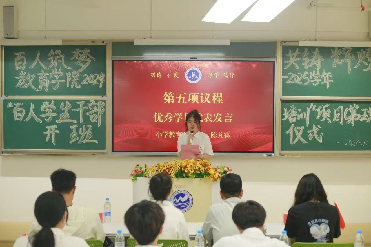 2023级小学教育5班陈芃霖同学作为第四期“百人干部培训班”的优秀学员代表发言。她向大家分享了一年以来的学习与成长,号召各位同学干部以此次培训为开端,争做一名“肩上有责、脚下有路、心中有戒”的新时代青年,坚定理想信念,全心全意为同学服务,积极主动参与工作,脚踏实地付诸实践,为学院的发展贡献自己的一份力量。