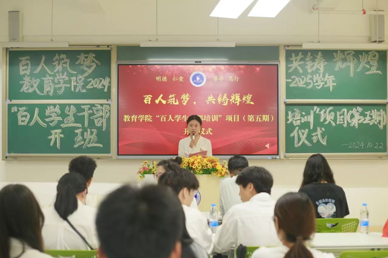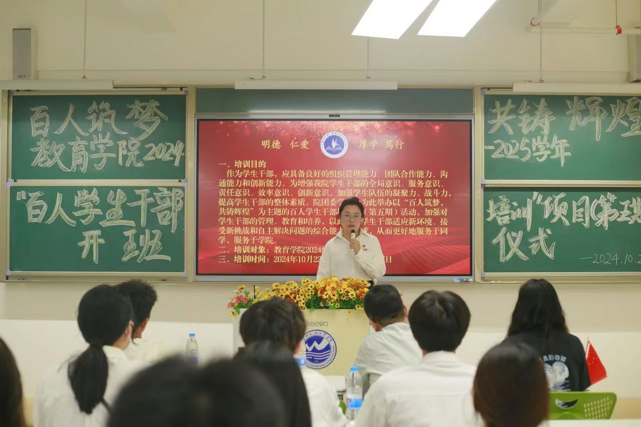 百人学生干部培训项目是由教育学院团委牵头,面向教育学院全体学生干部开展的综合性培训,是我院为培养具有高度责任感、卓越领导力和良好综合素质的学生干部而精心策划的一项重要举措。希望通过有计划的学生干部培训,能提高学院学生管理水平,培养优秀学生干部,提高学院学生干部队伍素质,增强学生干部责任感。其旨在进一步加强我院学生干部队伍建设,培养学生干部组织管理能力、团队合作能力,树立起“全心全意为广大学生服务”的意识,打造素质过硬、作风过硬、能力过硬的学生干部队伍,推进我院各项工作高质量发展。