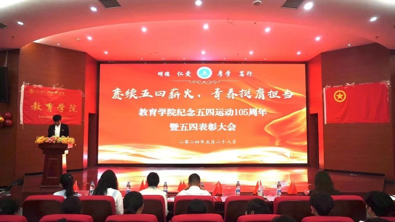 为贯彻落实习近平总书记关于青年工作的重要思想,持续弘扬五四精神,表彰先进、树立典型,引领广大团员青年在青春的赛道上奋力奔跑。2024年5月28日晚,我院于学术报告厅举办“赓续五四薪火,青春挺膺担当”教育学院纪念五四运动105周年暨2023年度五四表彰大会。本次大会由学院分党委书记、副院长林业铖副教授,教育学院团委书记、办公室副主任修丽萍老师,学院全体辅导员以及各班级学生代表共同参与,会议由教育学院团委副书记陈杰明老师主持。