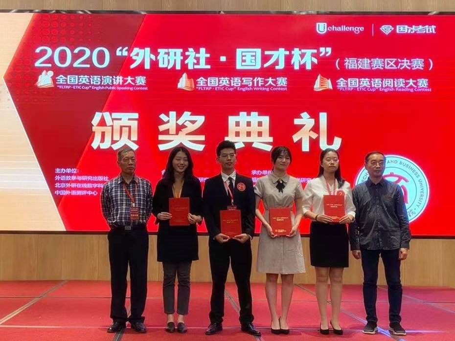 11月7-8日,2020年“外研社-国才杯”全国英语写作、阅读与演讲大赛(福建赛区决赛)在福州工商学院举行,大赛吸引了全省43所高校300余名选手同台竞技。在演讲大赛中,我校外国语学院2018级英语专业张宇辰(指导教...