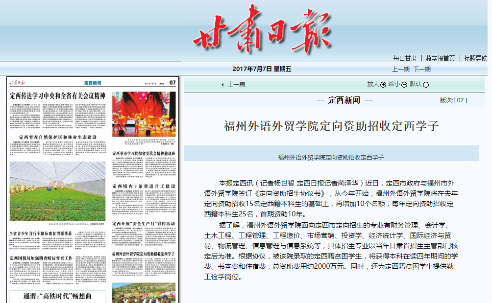 学校开元网站登录入口 开元网站登录入口办公室 第(2017)178期 中共开元网站登录入口委员会党委工作部 总第1966 2017年7月7日 甘肃日报报道:我校定向资助招...