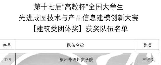 我校建筑类先进成图技术赛道参赛队伍由智能建造学院教师黄艳丽、方伟国指导,获得二等奖2项,三等奖2项;团队赛由黄艳丽、方伟国、吴繁超、黎小英指导,获得了三等奖1项,取得了突破性的好成绩,创造了新的辉煌!