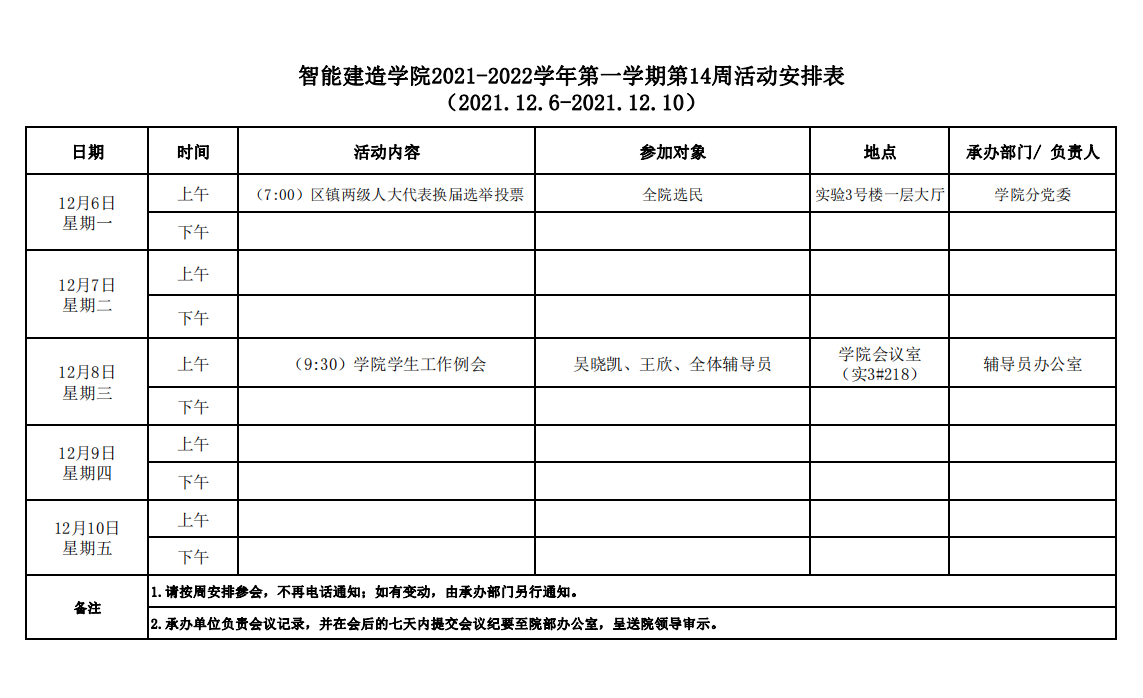 智能建造学院2021-2022学年第一学期第14周活动安排表