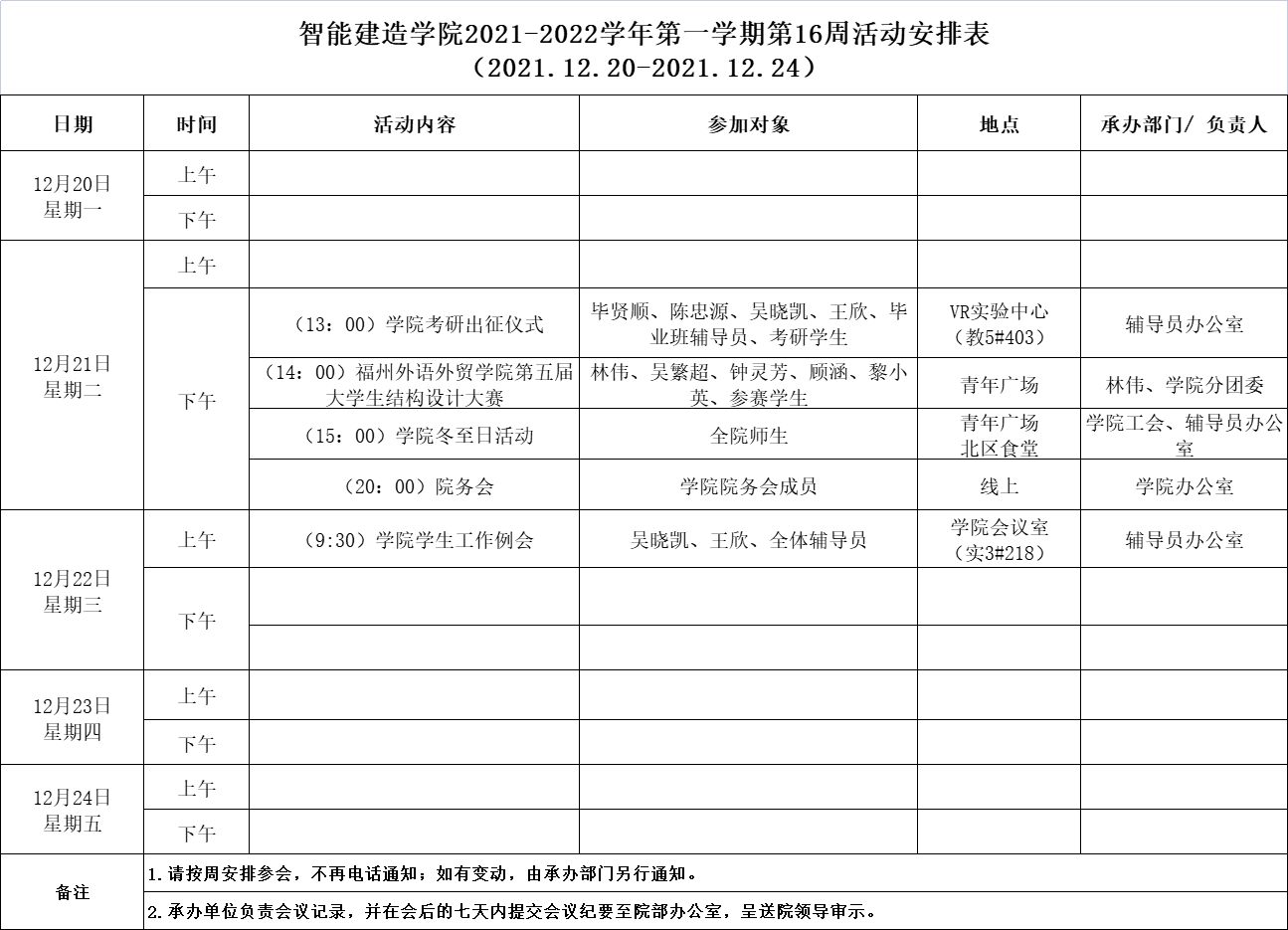 智能建造学院2021-2022学年第一学期第16周活动安排表