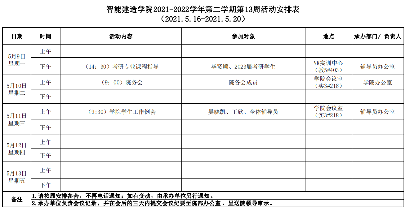 智能建造学院2021-2022学年第二学期第13周活动安排表