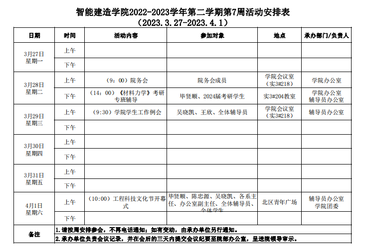 智能建造学院2022-2023学年第二学期第7周活动安排表