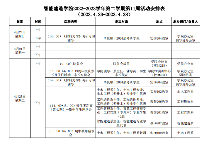 智能建造学院2022-2023学年第二学期第11周活动安排表