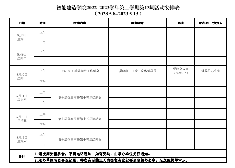 智能建造学院2022-2023学年第二学期第13周活动安排表