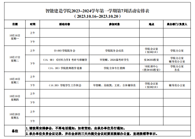 智能建造学院2023-2024学年第一学期第7周活动安排表
