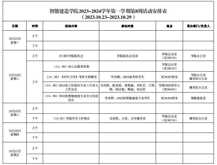 智能建造学院2023-2024学年第一学期第8周活动安排表