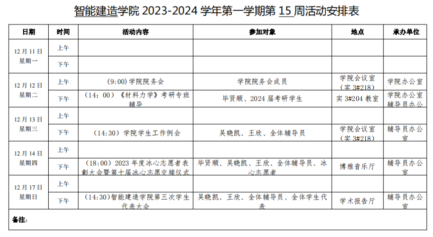 智能建造学院2023-2024学年第一学期第15周活动安排表