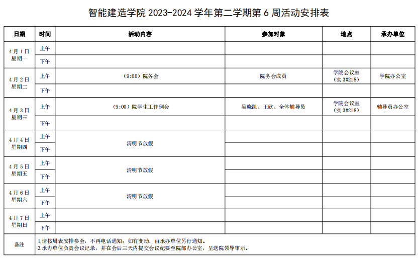 智能建造学院2023-2024学年第二学期第6周活动安排表